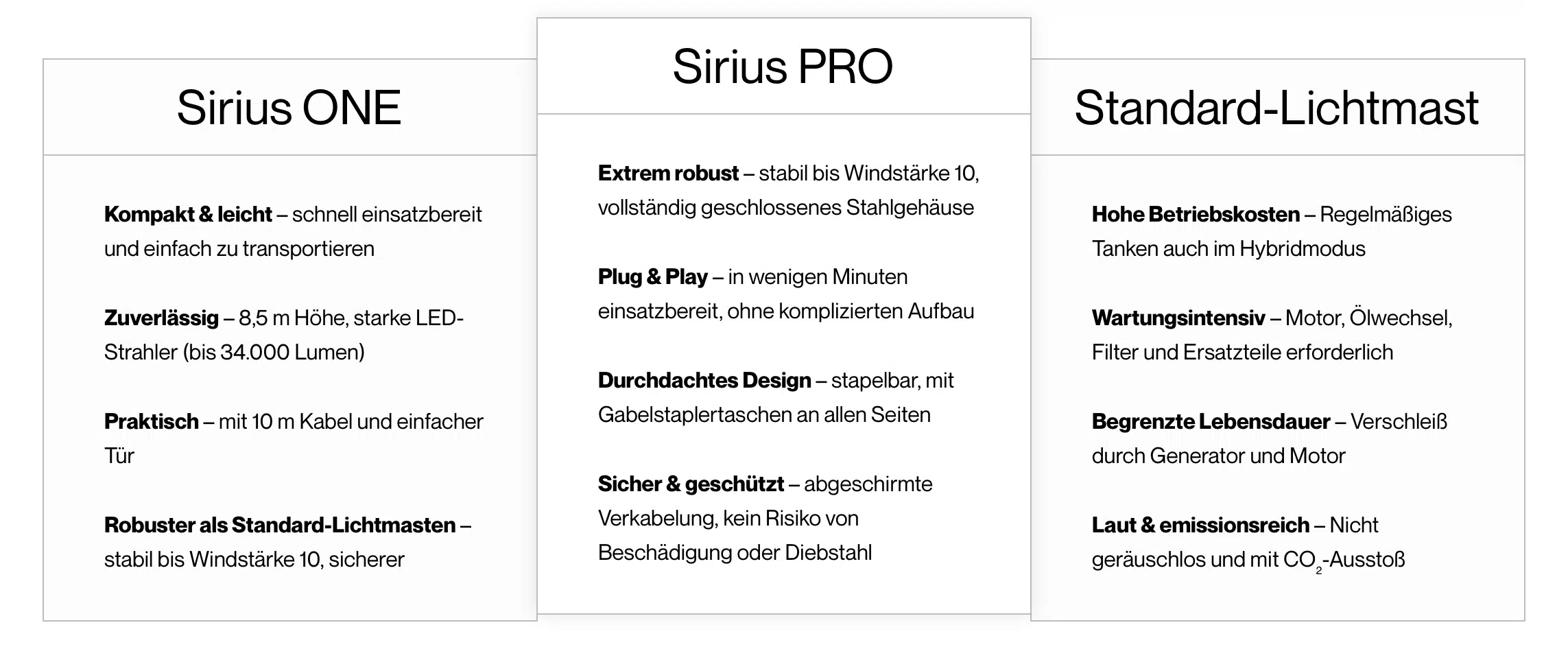 Sirius ONE oder PRO, welcher ausfahrbare Lichtmast passt zu Ihrem Projekt?